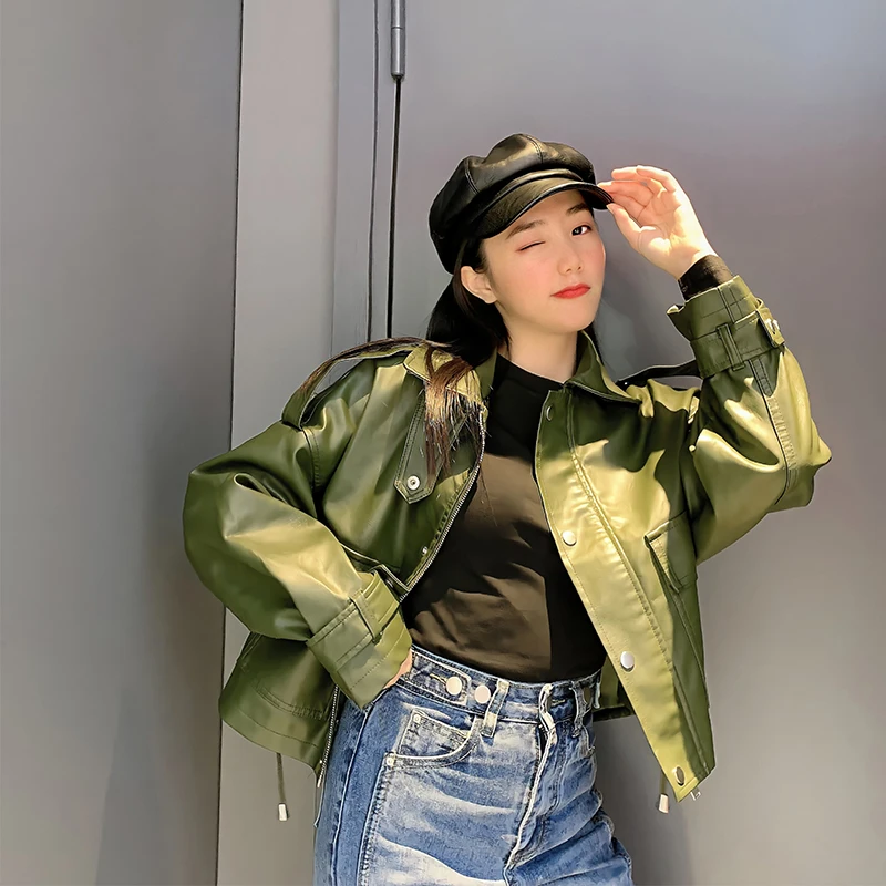2021 Spring Women Short Faux Leather Jacket Biker Green Autumn Coat Big Pocket PU Motorcycle Jackets Loose Streetwear Outerwear